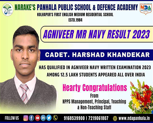 Proud to announce Narake's Panhala Public School & Defence Academy CADET. Harshad Khandekar has qualified in Agniveer Navy Written Examination 2023 among 12.5 lakh students who appeared all over India.