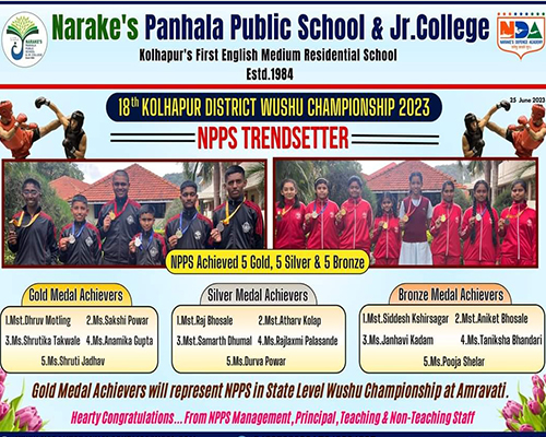 रविवार दि. 25/06/2023 रोजी कोल्हापूर येथे १८वी जिल्हास्तरीय वुशू चम्पियनशिप स्पर्धा नुकतीच पार पाडली. या स्पर्धेमध्ये कोल्हापूर जिल्हयातील विविध शाळांमधील विद्यार्थ्यांनी सहभाग घेतला होता. त्यामध्ये पन्हाळा येथील नरकेज् पन्हाळा पब्लिक स्कूल व ज्युनिअर कॉलेज पन्हाळा येथील विद्यार्थ्यांनी सहभाग घेऊन घवघवीत यश संपादन केले आहे. क्रिडाशिक्षक अमर मिरजे सर, मुख्याध्यापिका महेश्वरी चौगुले मॅडम, संस्थेचे अध्यक्ष मा. श्री. संदीप नरके सर यांचे मार्गदर्शन मिळाले.