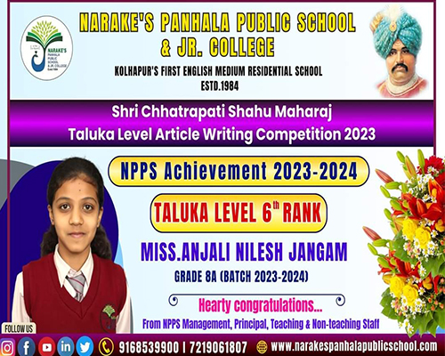 या स्पर्धेत नरकेज पन्हाळा पब्लिक स्कूल मधील कु. अंजली निलेश जंगम ( इयत्ता ८वी) हिने इयत्ता ८ वी ते १० वीच्या गटामध्ये सहावा क्रमांक मिळवला आहे. कोल्हापूर शिक्षण विभाग व शाळेतील व्यवस्थापनाने उपलब्ध करून दिलेल्या मार्गदर्शनाखाली विद्यार्थिनीने यथोचित यश संपादन केले. यशस्वी विद्यार्थिनीचे हार्दिक अभिनंदन. शाळेच्या मराठी विषय शिक्षिका सौ प्रेमा स्वामी मॅडम व सौ वैशाली कुबडे वर्ग शिक्षिका संचिता कुंभार यांचे मार्गदर्शन लाभले